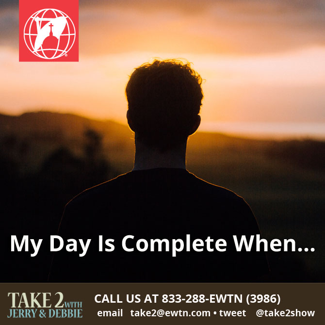 My Day Is Complete When… March 14, 2022 by debbiegeorgianni Leave a comment Please call us and finish the sentence. My day is complete when… 1-833-288-3986 EWTN Catholic Radio · My day is complete when… Take 2 with Jerry & Debbie 031422 Also on Catholic Radio. Share this:TweetMore Click to email a link to a friend (Opens in new window) Email Like Loading... Related