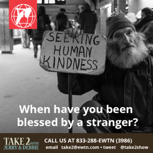 Tell us more on the next Take 2 with Jerry & Debbie 833-288-3986 about a time when a stranger blessed you. Was it in conversation, prayer, finances, food or their time or wisdom?