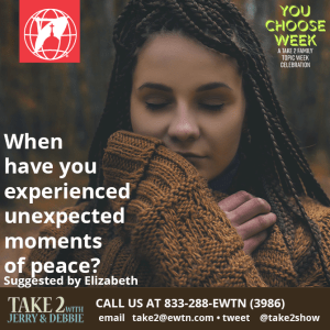 It’s YOU CHOOSE Week with Elizabeth asking when have you experienced unexpected moments of peace? You can chime in next on Take 2 with Jerry & Debbie at 833-288-3986