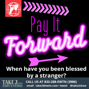 Tell us more on the next Take 2 with Jerry & Debbie 833-288-3986 about a time when a stranger blessed you. Was it in conversation, prayer, finances, food or their time or wisdom?
